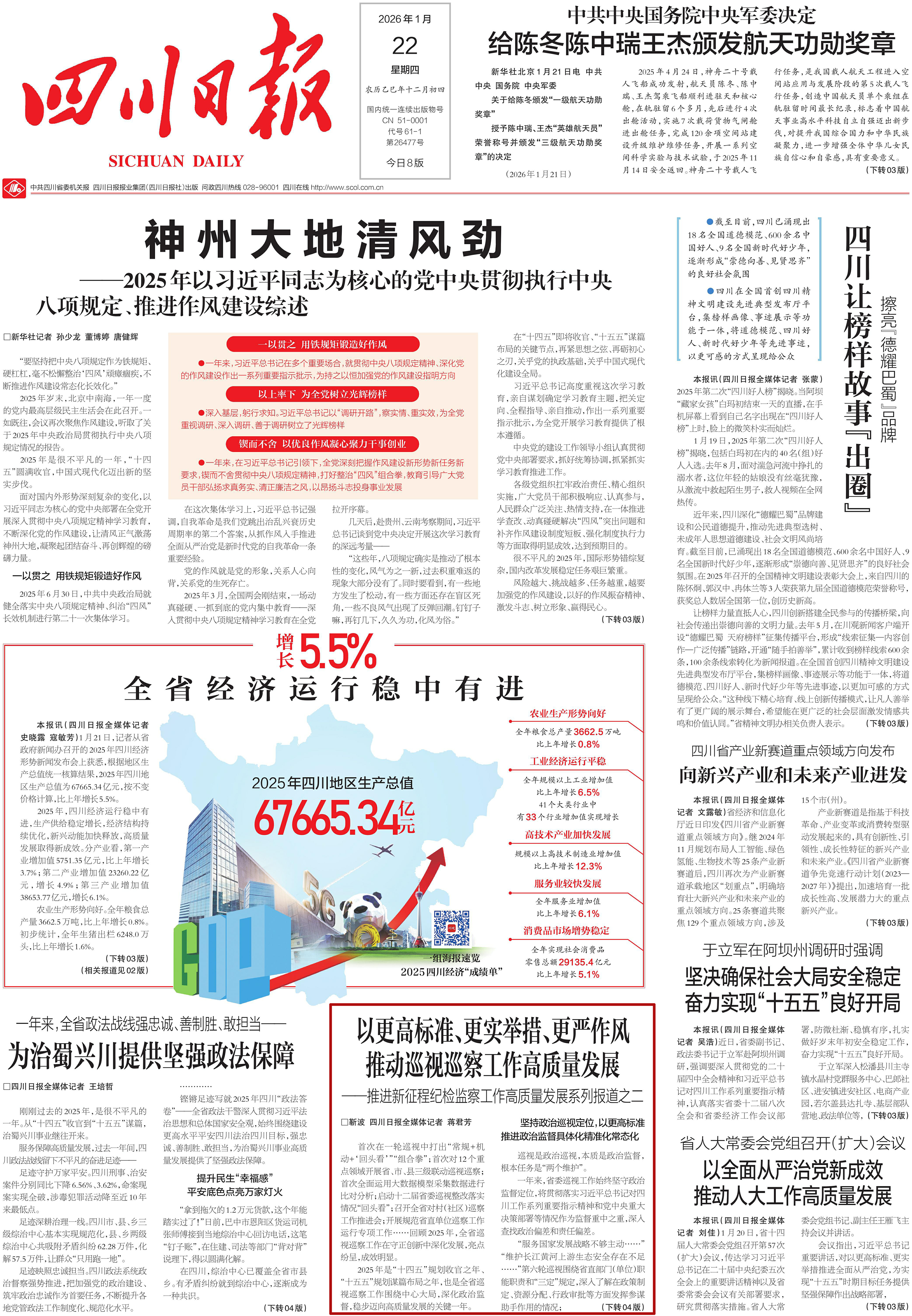2026年1月22日,《四川日报》头版刊发《以更高标准、更实举措、更严作风推动巡视巡察工作高质量发展——推进新征程纪检监察工作高质量发展系列报道之二》。