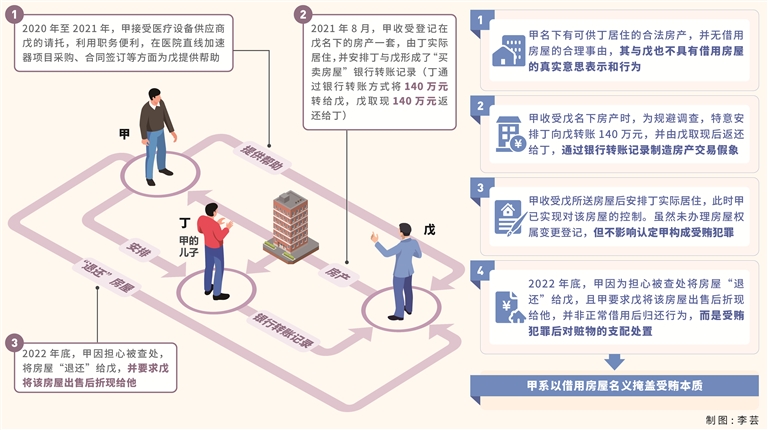 本案中,甲系以借用房屋名义掩盖其受贿本质。第一,甲名下有可供丁居住的合法房产,并无借用房屋的合理事由,其与戊也不具有借用房屋的真实意思表示和行为,如签订借用合同等。根据甲供述,该房产系戊给他的好处,二人对此心知肚明。第二,2021年8月,甲收受戊名下房产时,为规避调查,特意安排丁向戊转账140万元,并由戊取现后返还给丁,通过银行转账记录制造房产交易假象。第三,甲收受戊所送房屋后安排丁实际居住,此时甲已通过丁实现对该房屋的控制。虽然未办理房屋权属变更登记,但不影响认定甲构成受贿犯罪。第四,2022年底,甲因为担心被查处将房屋“退还”给戊,且甲要求戊将该房屋出售后折现给他,并非正常借用后的归还行为,而是甲受贿犯罪后对赃物的支配处置。综上,甲构成受贿罪。