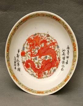 刘雨亭泗安胜倭纪念彩瓷盘 川军烟枪