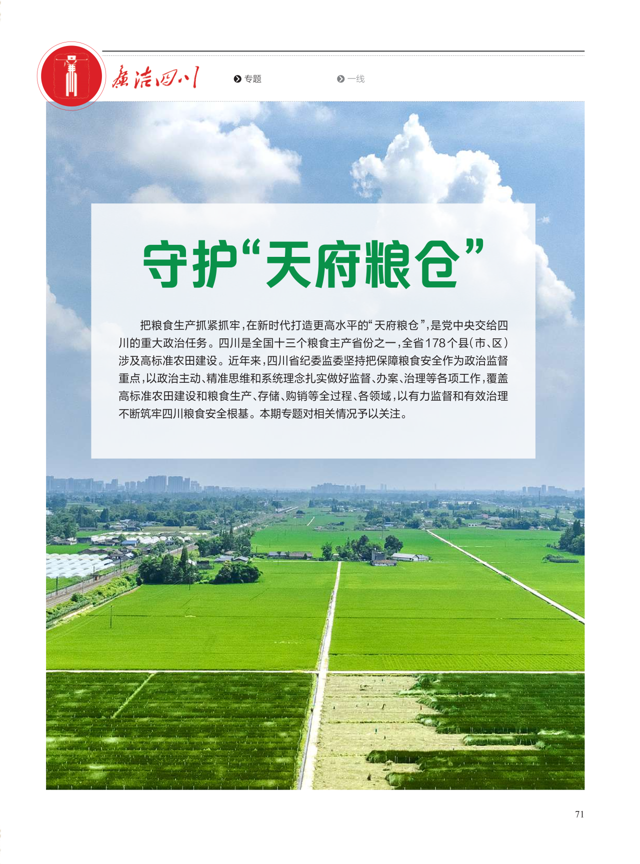粮食安全是“国之大者”。把粮食生产抓紧抓牢,在新时代打造更高水平的“天府粮仓”,是党中央赋予四川的重大使命任务。近年来,四川省委坚决扛牢粮食安全政治责任,省纪委监委立足职责定位,坚持把保障粮食安全作为政治监督重点,会同发展改革、农业农村等主责部门,先后围绕粮食购销、高标准农田建设、政策性种植业保险、农作物种子等领域开展专项整治,以一抓到底的韧劲和系统施治的理念,常态化推进惩处腐败、纠正乱象、促进治理各项工作,以有力有效监督筑牢“天府粮仓”安全防线。