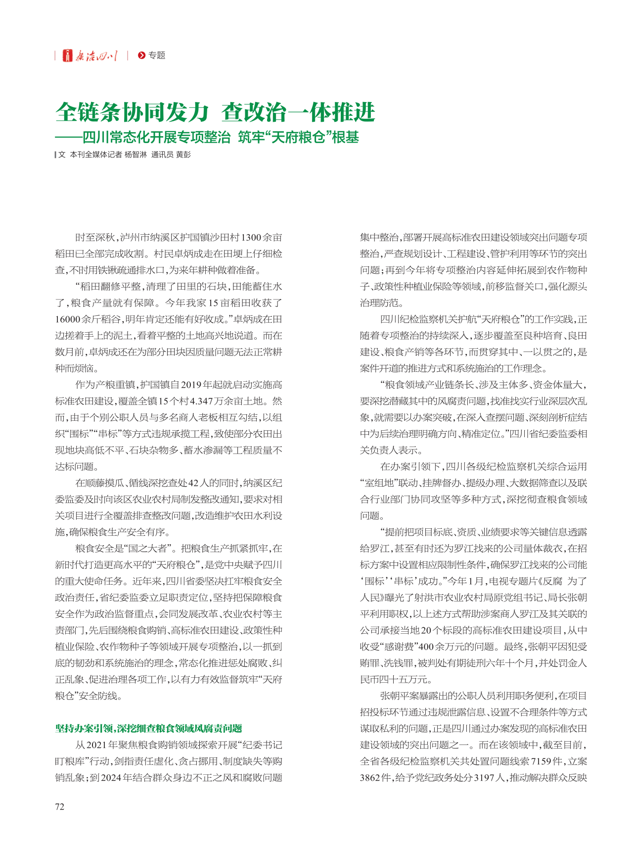 四川纪检监察机关护航“天府粮仓”的工作实践,随着专项整治的持续深入,其监督范围已逐步覆盖至良种培育、良田建设、粮食产销等各环节,而贯穿其中、一以贯之的,是案件开道的推进方式和系统施治的工作理念。