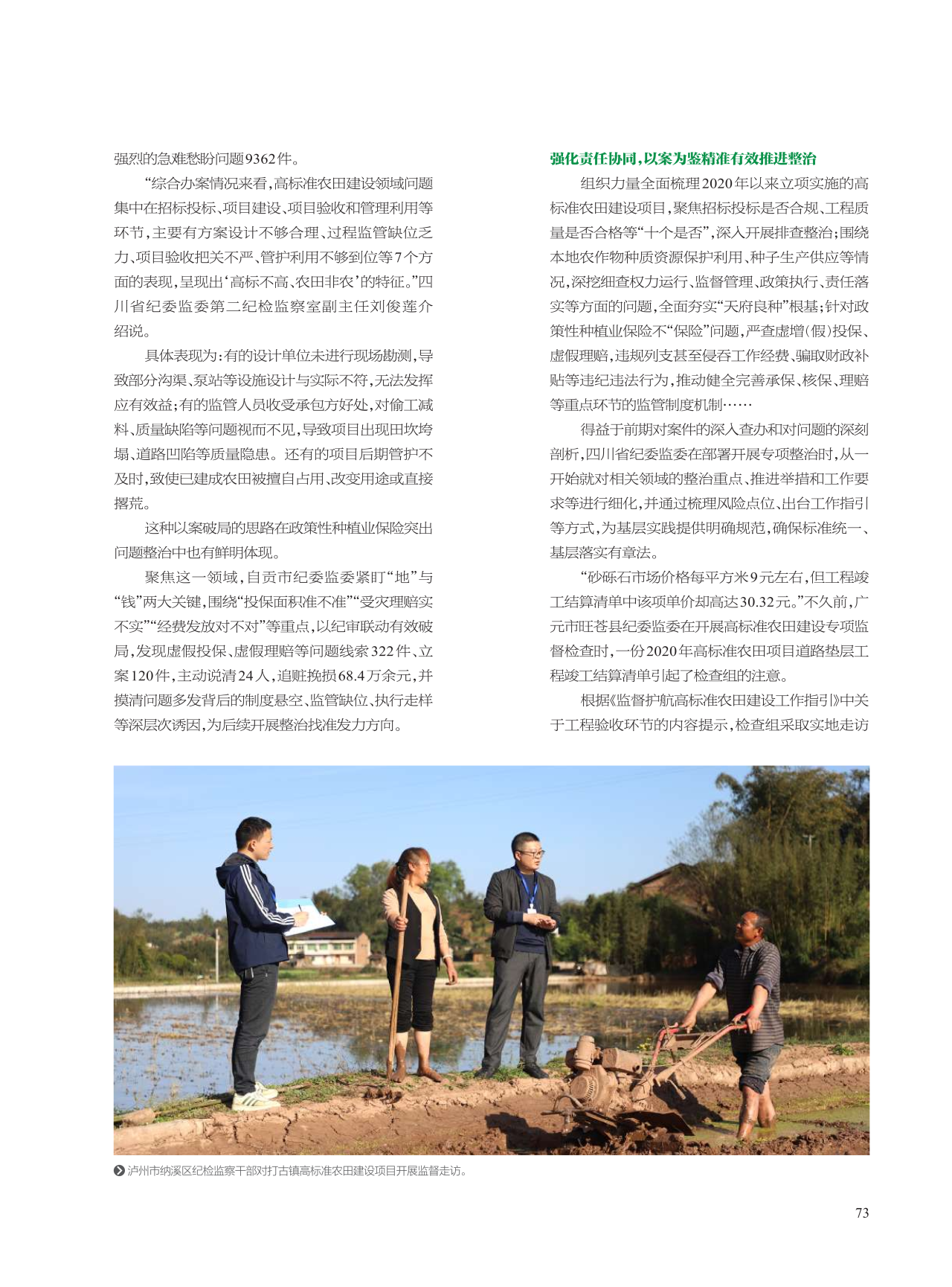 这一转变的取得源自前期案件查办发现的共性问题得到有效整改。针对办案发现的高标准农田监管标准低、后期管护利用不到位等问题,大竹县纪委监委向该县农业农村局发出监察建议书,推动构建县乡村三级巡查体系,强化日常巡查。并在此基础上,因地制宜推进农田改造,采取“小田并大田、简易化田埂”等措施,全力打造优质农田85万余亩,为开展多业经营、综合利用奠定基本条件,保障高标准农田既高产又高效。
