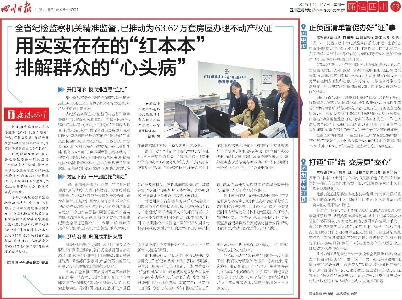 2025年11月17日,《四川日报》廉洁四川刊发《全省纪检监察机关精准监督,已推动为63.62万套房屋办理不动产权证 用实实在在的“红本本”排解群众的“心头病”》。
