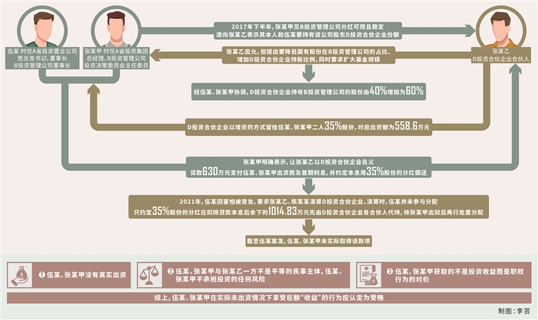 第三,伍某、张某甲获取的不是投资收益而是职权行为的对价。本案中,伍某、张某甲二人看到D投资合伙企业因持股B投资管理公司获得了十分可观且稳定的分红,想要分一杯羹。张某乙一方之所以愿意以D投资合伙企业名义贷款替伍某、张某甲出资并让渡分红权,根本原因在于伍某、张某甲二人的职权可以给D投资合伙企业增加收益,从而实现“共赢”。事实上,伍某、张某甲二人各自利用职权帮助D投资合伙企业在B投资管理公司的持股比例由40%增加到60%,基金投资规模也成倍扩大。双方相关行为的实质就是“权力”与“利益”的交换,35%股份只是利益输送的幌子,本质上是张某乙一方将35%股份应得利益让渡给伍某、张某甲二人。