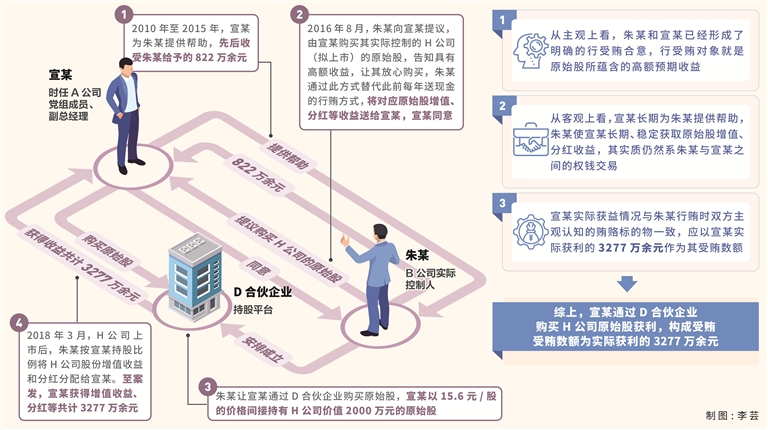 其中,2010年至2015年,宣某为B公司原料供应业务提供帮助,先后11次收受B公司实际控制人朱某给予的100万美元、20万欧元,折合共计822万余元。2016年8月,朱某向宣某提议,由宣某购买其实际控制的H公司(拟上市)的原始股,告知其公司上市后原始股将有3到5倍增值,并有高额分红,让其放心购买。朱某拟通过此方式将对应原始股增值、分红等收益送给宣某,替代此前每年送现金的行贿方式,宣某表示同意。朱某安排成立了D合伙企业作为持股平台,让宣某等多名国家工作人员(另案处理)通过D合伙企业购买原始股。宣某以15.6元/股的价格,通过D合伙企业间接持有H公司价值2000万元的原始股。2018年3月,H公司上市后,D合伙企业陆续减持H公司的股份,朱某将增值收益、H公司分红按宣某持股比例分配给宣某。至案发时,股份已陆续全部售出,扣除本金后,宣某获得增值、分红等收益共计3277万余元。