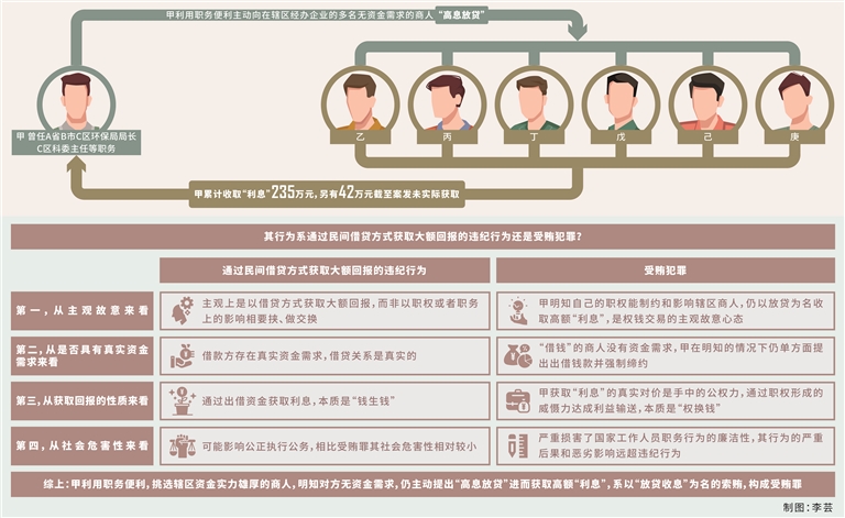 第一种意见认为,2018年《中国共产党纪律处分条例》第九十条规定,“借用管理和服务对象的钱款、住房、车辆等,影响公正执行公务,情节较重的,给予警告或者严重警告处分;情节严重的,给予撤销党内职务、留党察看或者开除党籍处分。通过民间借贷等金融活动获取大额回报,影响公正执行公务的,依照前款规定处理。”甲向丙、丁等商人“高息放贷”,但未为这些人谋取过利益,即便其行为不妥,也不过是作为党员领导干部通过民间借贷获取大额回报的违纪行为,不构成受贿。第二种意见认为,《中华人民共和国刑法》第三百八十五条规定,“国家工作人员利用职务上的便利,索取他人财物的,或者非法收受他人财物,为他人谋取利益的,是受贿罪。”根据刑法规定,索贿并不需要具备谋利事项,甲作为国家工作人员,利用其担任C区环保局局长、科委主任等职务便利,通过“放贷收息”方式向辖区内具有行政管理关系的丙、丁等多名商人索取财物,应依照刑法关于受贿犯罪的规定定罪处罚。