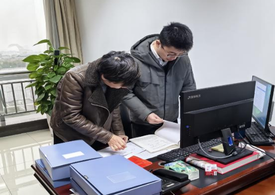 驻院纪检监察干部工作组查阅联动整改资料。(戴志杰 摄)