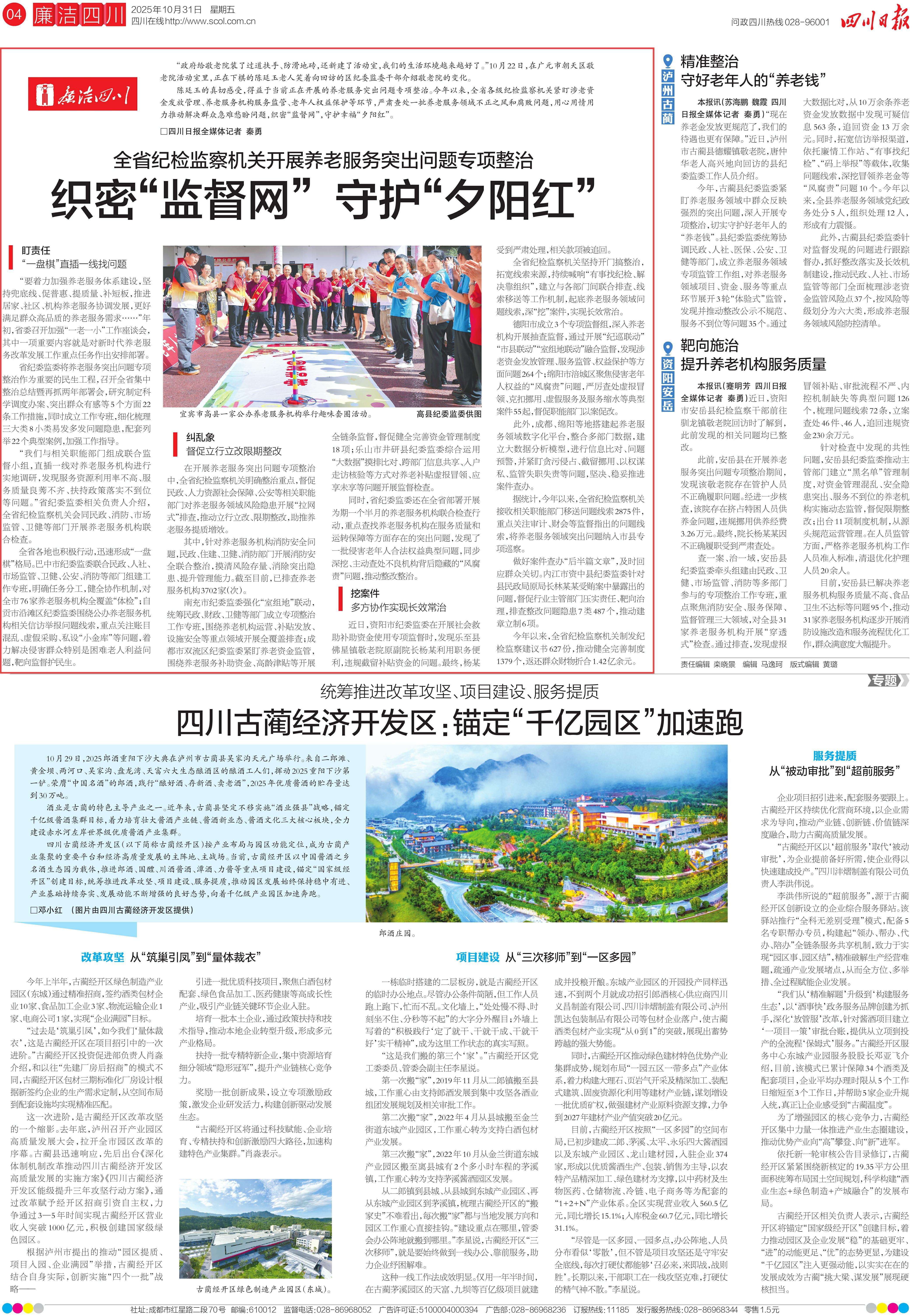 2025年10月31日,《四川日报》廉洁四川版刊发《全省纪检监察机关开展养老服务突出问题专项整治 织密“监督网” 守护“夕阳红”》。