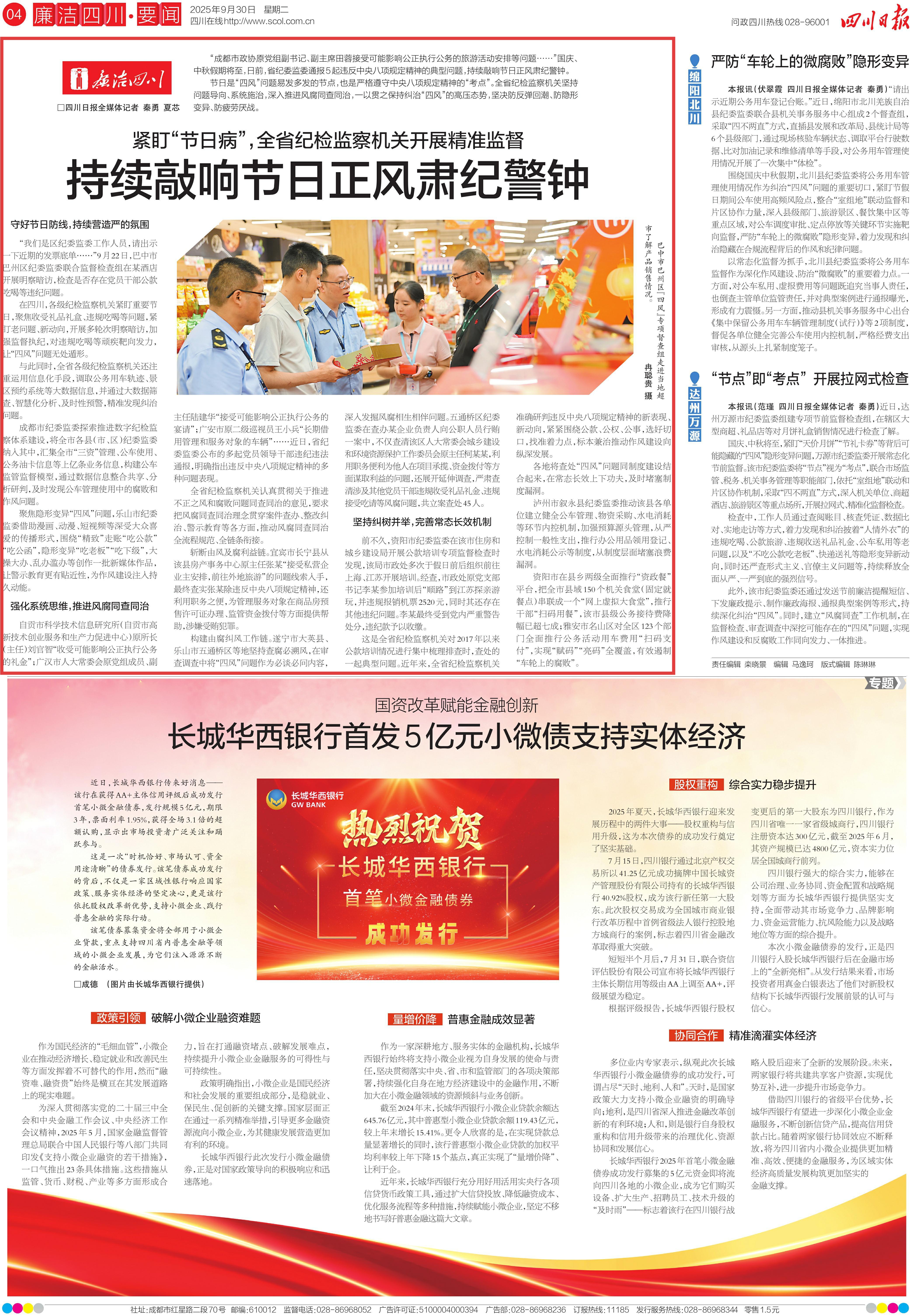2025年9月30日,《四川日报》廉洁四川·要闻版刊发《紧盯“节日病”,全省纪检监察机关开展精准监督 持续敲响节日正风肃纪警钟》。