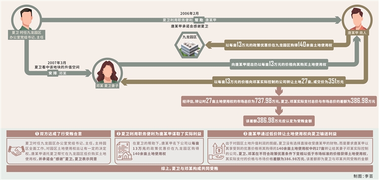 其中,2006年2月,夏卫利用担任九龙园区办公室党组书记、主任的职务便利,帮助商人唐某甲以每亩13万元的政策优惠价在九龙园区购得140余亩土地使用权,唐某甲承诺会感谢夏卫。2007年3月,夏卫看中该地块的升值空间,安排妻子邓某向唐某甲提出仍以每亩13万元的价格向其购买土地使用权,唐某甲为兑现之前的承诺,以每亩13万元的价格向邓某实际控制的公司转让土地27亩,成交价为351万元。经评估,转让时该地块土地使用权市场价为737.98万元,成交价比市场价低386.98万元。