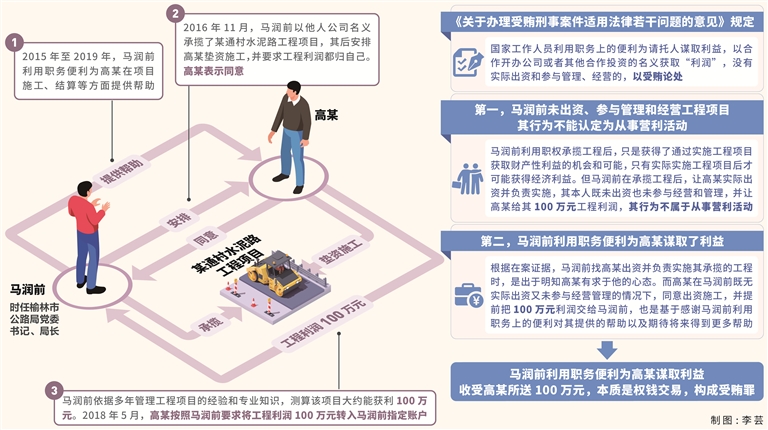 李佳悦:有观点认为,马润前利用职权承揽工程项目,后让高某垫资施工自己获利100万元的行为,属于违规从事营利活动的违纪行为,不构成受贿犯罪。本案中,涉案工程项目确实是马润前为自己承揽的,但不能就此认定其获利100万元的行为属于违规从事营利活动的违纪行为。