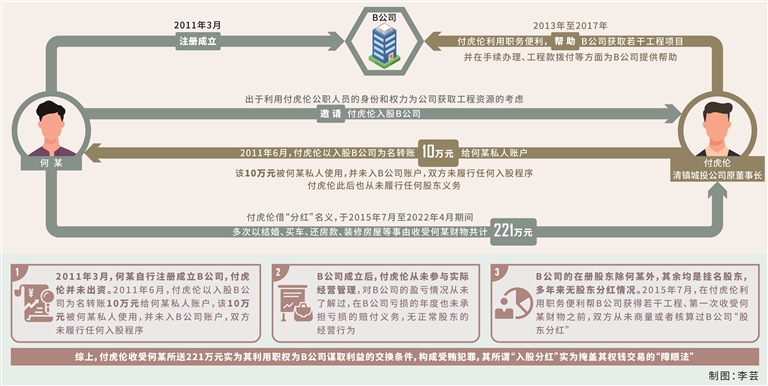 以投资入股分红名义收受贿赂221万元。付虎伦与B公司(工程建筑公司)法定代表人何某是多年朋友。2011年6月,付虎伦在何某成立B公司不久,曾以入股B公司为名转账10万元给何某私人账户,但双方没有履行入股法定程序,付虎伦也从未履行股东义务。2013年至2017年,付虎伦利用担任清镇城投公司董事长的职务便利,在项目获取、手续办理、工程款拨付等方面为B公司提供帮助,为此其借“分红”名义,于2015年7月至2022年4月期间,多次以结婚、买车、还房款、装修房屋等事由收受何某财物共计221万元。