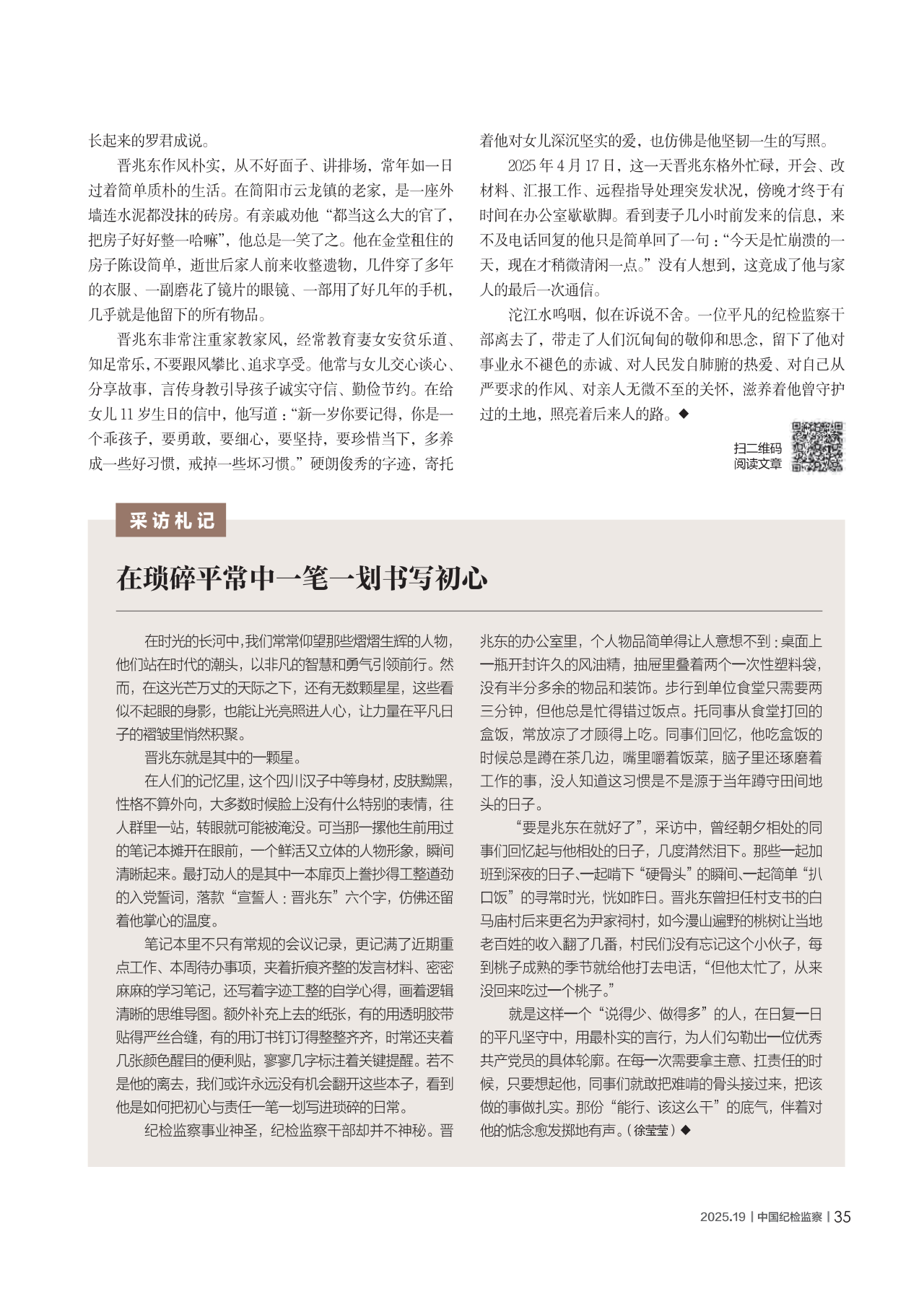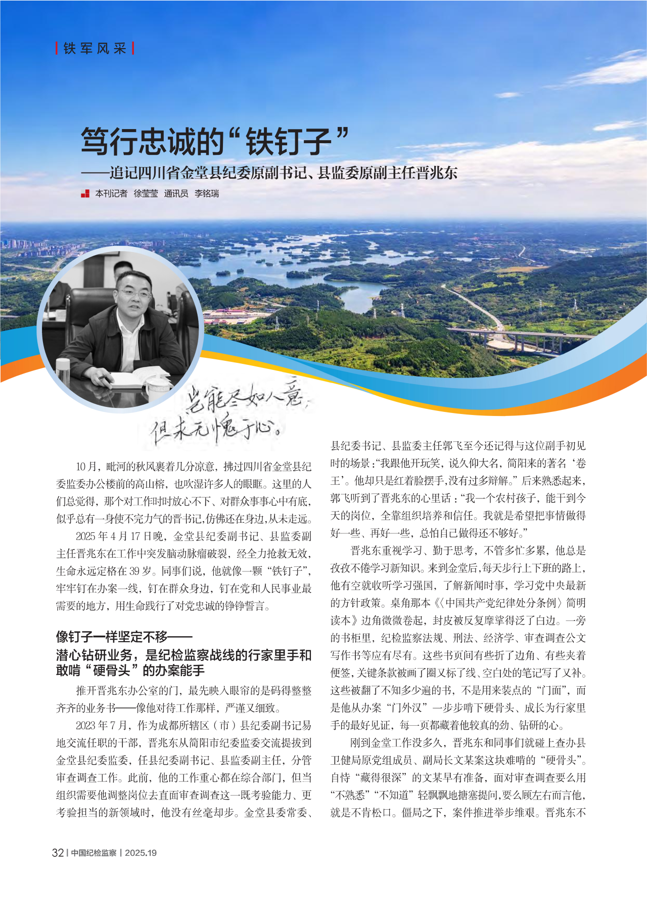 2025年《中国纪检监察》杂志第19期“铁军风采”栏目刊发《笃行忠诚的“铁钉子” ——追记四川省金堂县纪委原副书记、县监委原副主任晋兆东》。