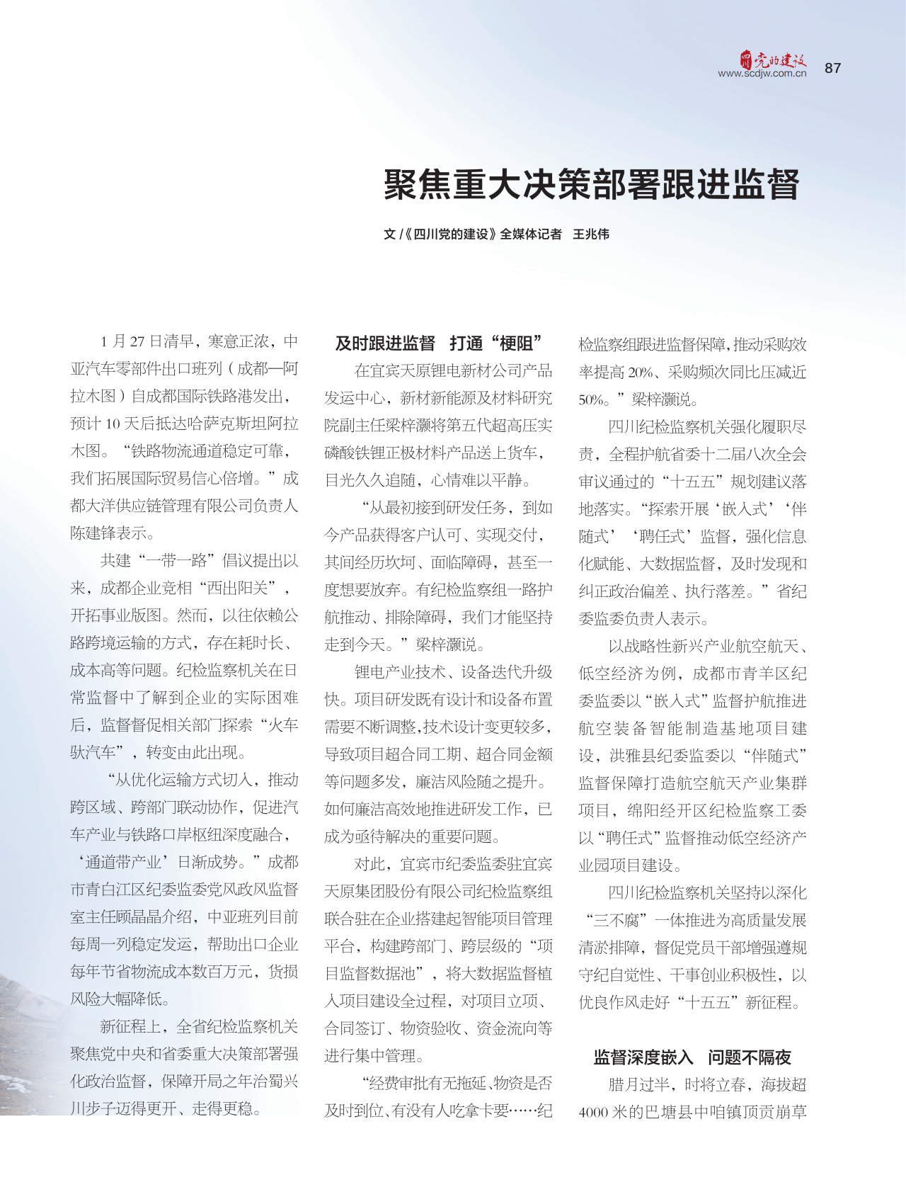 在资阳市,纪检监察机关护航中国中车与哈萨克斯坦国家铁路公司新能源合作项目——CKD6H 型机车在中车资阳机车有限公司装配车间下线,标志着中国绿色轨道交通装备在国际市场取得历史性突破;在北川羌族自治县,纪检监察机关监督保障全球首个百兆瓦级重卡超级充电站成功投运,助力北川绿色物流实现转型发展。