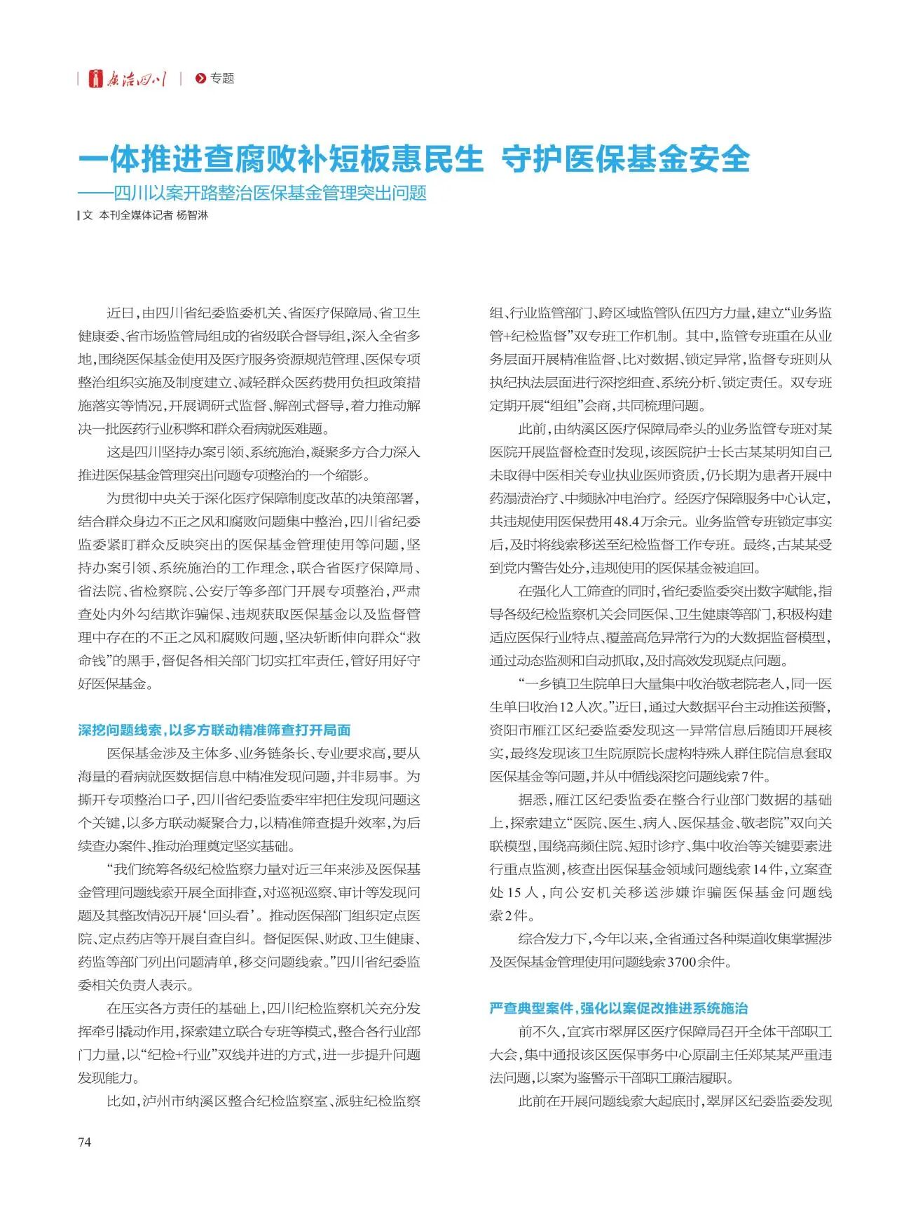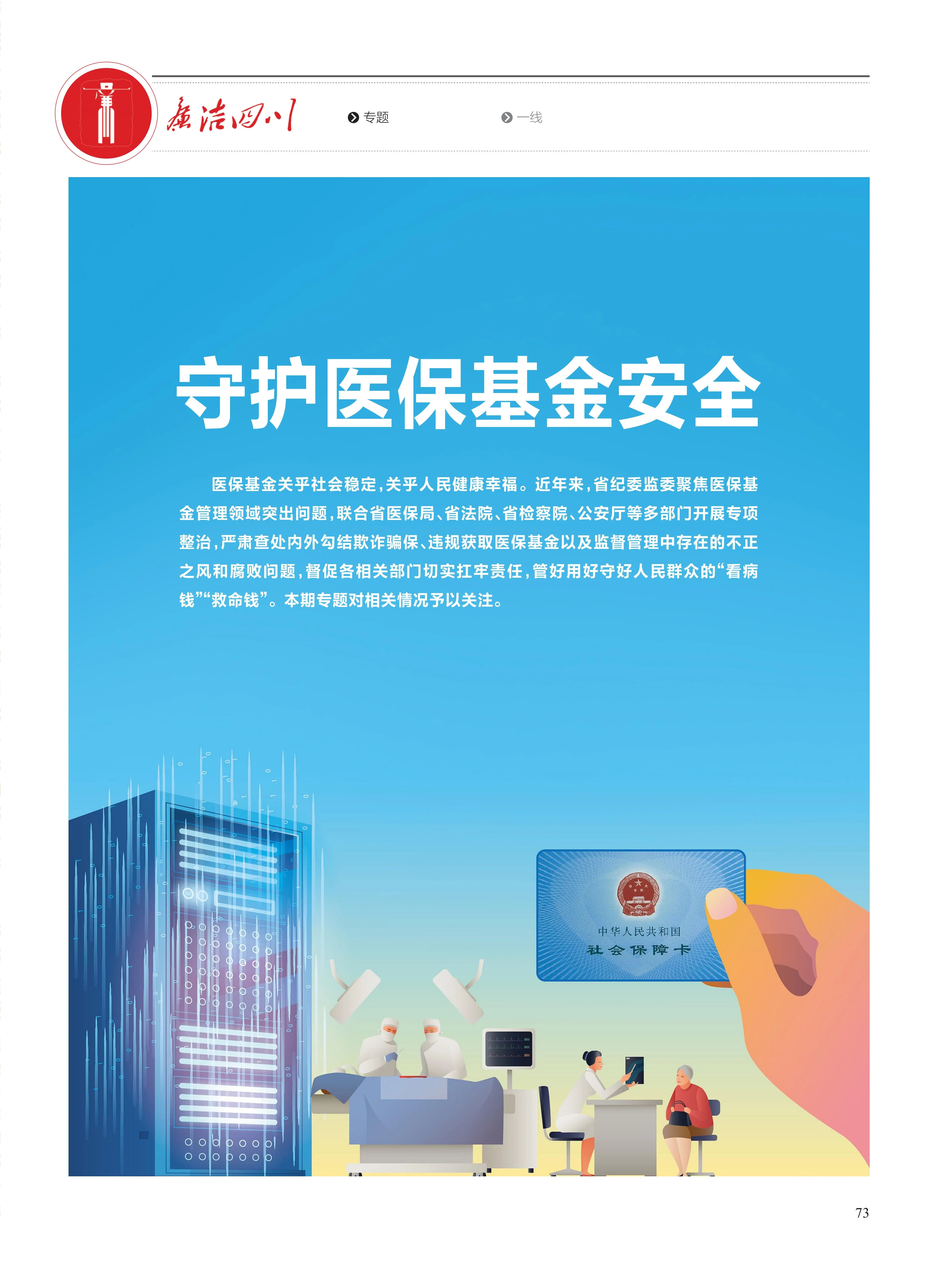为贯彻中央关于深化医疗保障制度改革的决策部署,结合群众身边不正之风和腐败问题集中整治,四川省纪委监委紧盯群众反映突出的医保基金管理使用等问题,坚持办案引领、系统施治的工作理念,联合省医疗保障局、省法院、省检察院、公安厅等多部门开展专项整治,严肃查处内外勾结欺诈骗保、违规获取医保基金以及监督管理中存在的不正之风和腐败问题,坚决斩断伸向群众“救命钱”的黑手,督促各相关部门切实扛牢责任,管好用好守好医保基金。