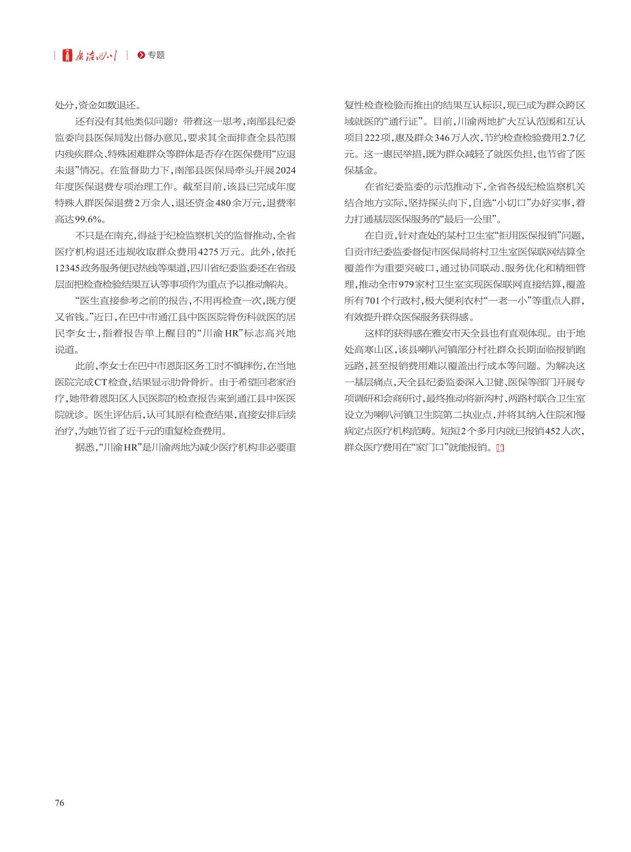 不只是在南充,得益于纪检监察机关的监督推动,全省医疗机构退还违规收取群众费用4275万元。此外,依托12345政务服务便民热线等渠道,四川省纪委监委还在省级层面把检查检验结果互认等事项作为重点予以推动解决。