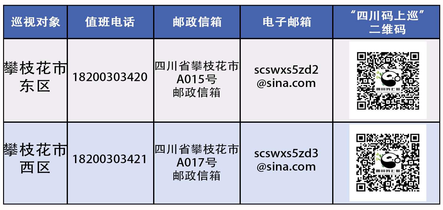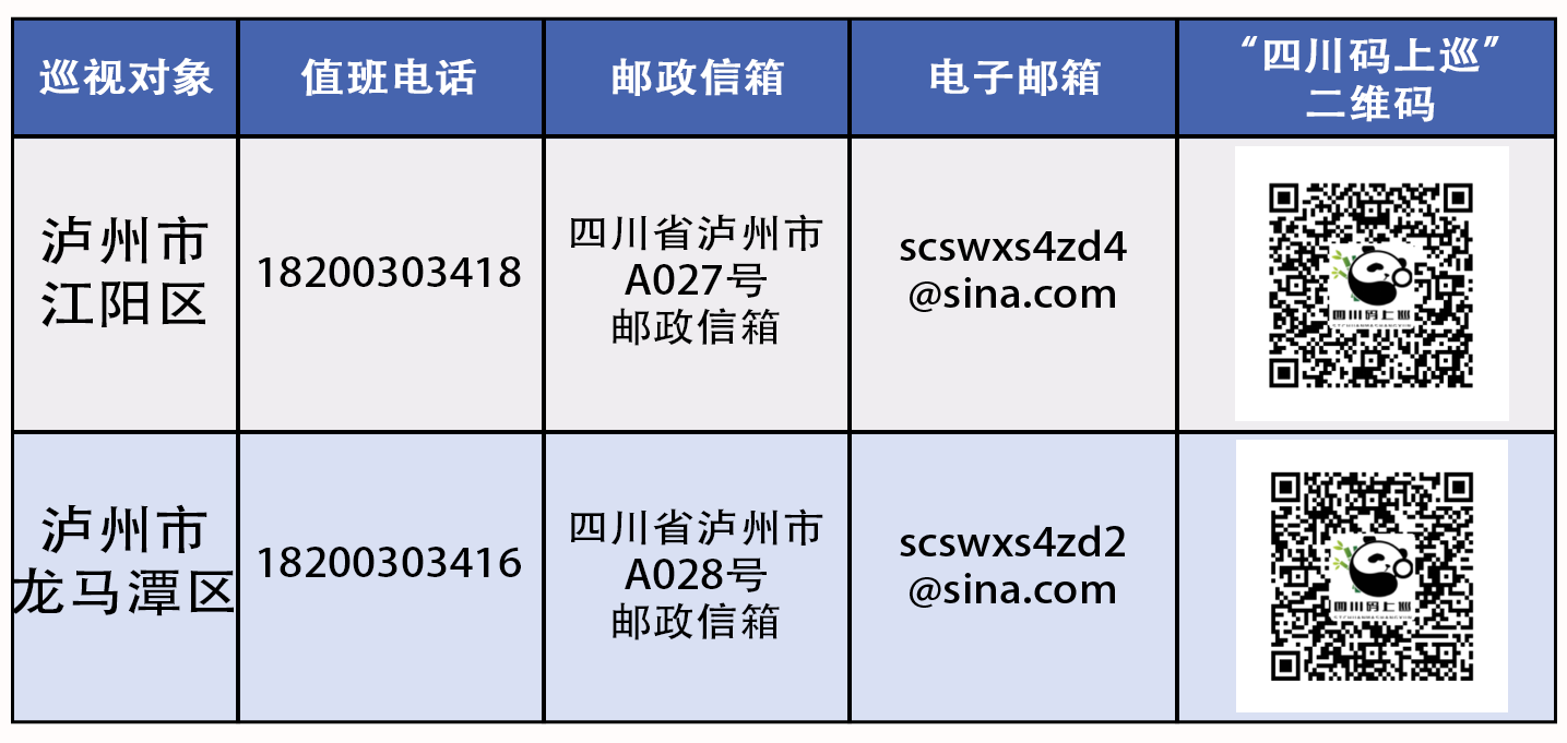 巡视期间,各省委巡视组设置了值班电话、邮政信箱、电子邮箱和“四川码上巡”二维码。省委巡视组主要受理反映被巡视党组织领导班子及其成员和下一级党组织领导班子主要负责人,以及重点岗位人员问题的来信、来电、来访,重点是关于违反政治纪律、组织纪律、廉洁纪律、群众纪律、工作纪律和生活纪律以及巡视整改等方面的问题反映。对其他不属于巡视受理范围的信访问题,将按规定由被巡视地区和有关部门认真处理。