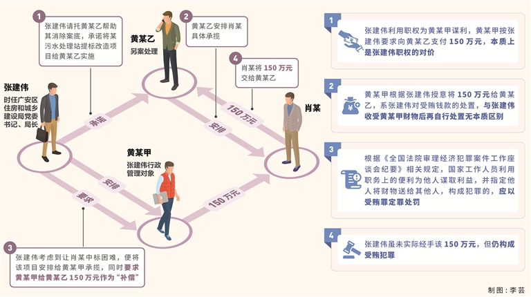 本案中,张建伟为向黄某乙输送好处,二人商定由黄某乙承揽某项目,后张建伟将该项目安排黄某甲承揽,并让黄某甲给黄某乙150万元“补偿费”,张建伟及其辩护人认为,这150万元是黄某甲和黄某乙买卖中标项目的费用,如何看待该意见?张建伟未经手该150万元,是否构成受贿?2021年5月,薛某按照张建伟要求,将25万元转账到张建伟特定关系人汤某银行账户,备注为“借款”,汤某收到后告知张建伟。张建伟被留置后,汤某将25万元退还给薛某。该起事实中,能否认定张建伟受贿25万元?我们特邀相关单位工作人员予以解析。