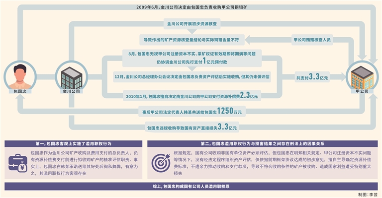 国有公司人员滥用职权罪。2009年6月,金川公司决定由包国忠负责收购甲公司铜钼矿。同年7月,韩某承诺事成之后给予包国忠好处,于是包国忠违反国务院国资委《企业国有资产评估管理暂行办法》、甘肃省国资委《履行出资人企业投资监督管理暂行办法》相关规定,未经专业机构评估探明储量,仅依据取样估算的储量及品位,初步商定资源补偿费3.5亿元。后金川公司开展初步资源核查,甲公司贿赂核查人员,导致作出的矿产资源核查量结论与实际铜钼含量不符。同年8月,包国忠无视甲公司注册资本不实、采矿权证有效期即将期满等问题,仍协调金川公司先行支付1亿元预付款。同年12月,金川公司总经理办公会议决定由包国忠负责资产评估后实施收购,但其仍未做评估。